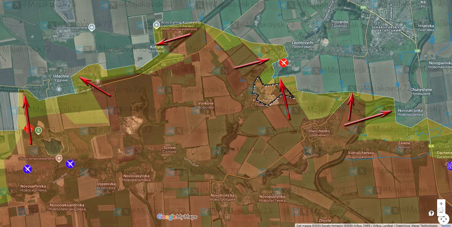 En Kurajove y Velyka Novosilka, lo más reseñable son, por un lado, los intentos rusos por llegar a Andríivka-Klevtsove, de los que hablamos ayer y que seguirían en marcha. Por otro, los pequeños avances al noroeste de Zelene Pole, con la vista puesta en Novoheorhíivka.