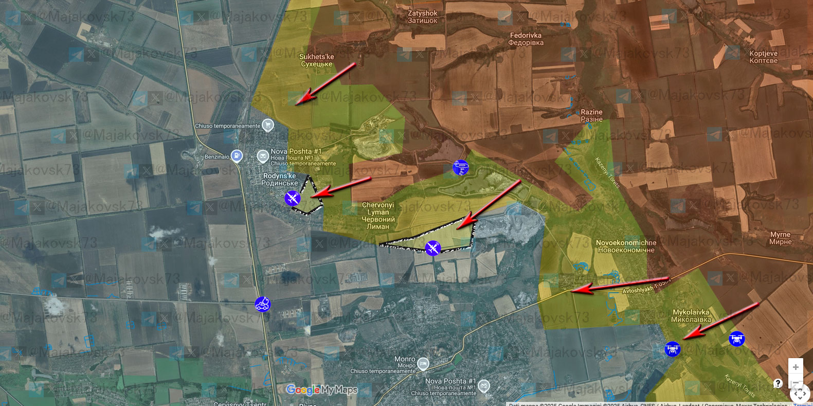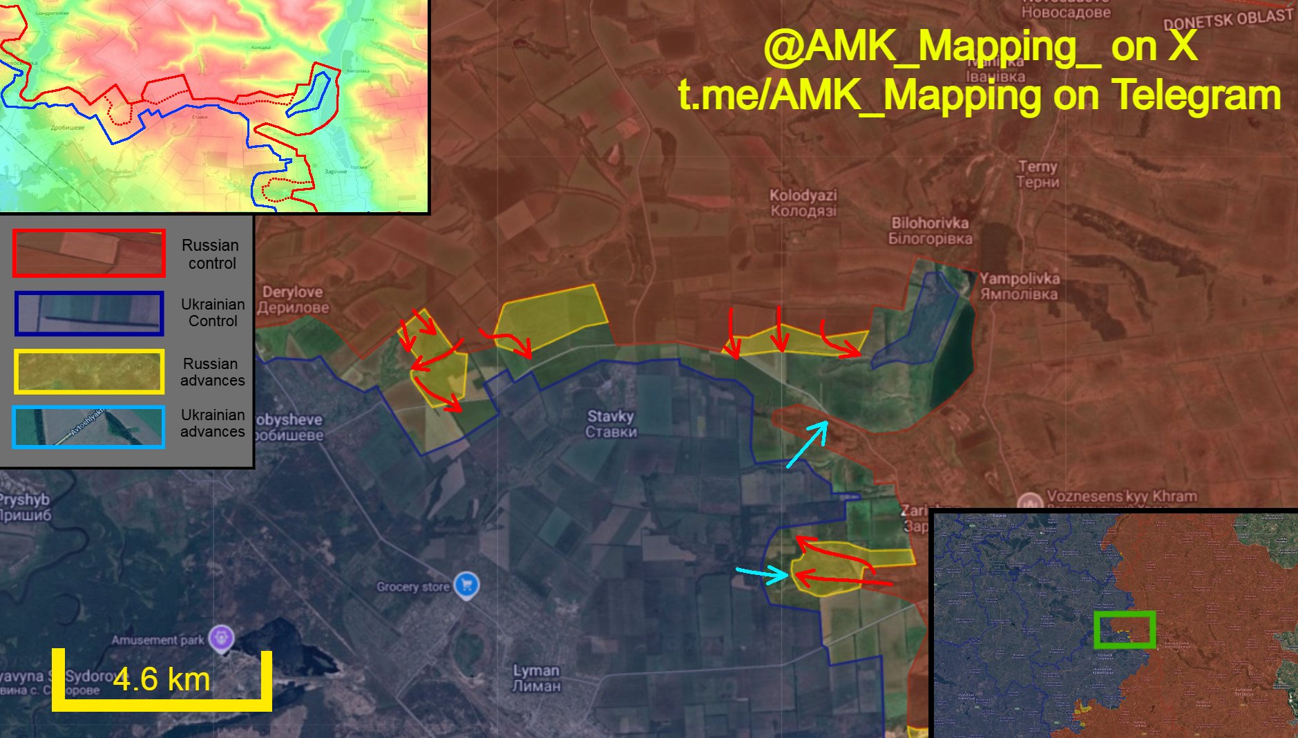 En Myrhorad/Pokrovsk la situación continúa siendo compleja, pues los DRGs rusos podrían haber llegado a la estación de ferrocarril, que está en una zona muy céntrica de la primera de estas ciudades, según reclaman fuentes de dicho país. Además de esto, el Ejército ruso podría haber ganado unos metros al noreste, en los alrededores de Chervonyi Limán y en Rodynske, si bien serían cambios mínimos.