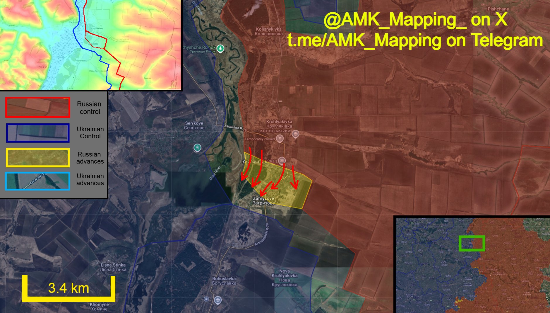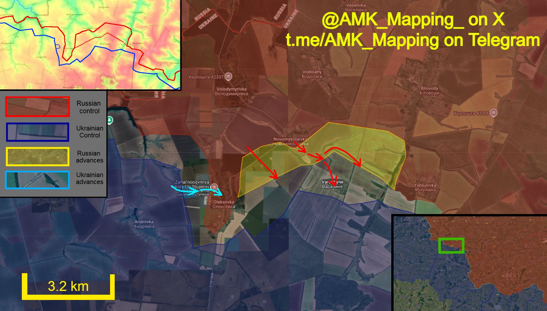 Comenzamos hoy por Sumy/Kursk, ya que allí se han registrado por un lado, ataques y al parecer avances rusos desde Novomykolaivka hacia Varachyne. Por otro, un ataque ucraniano contra Oleksíivka.