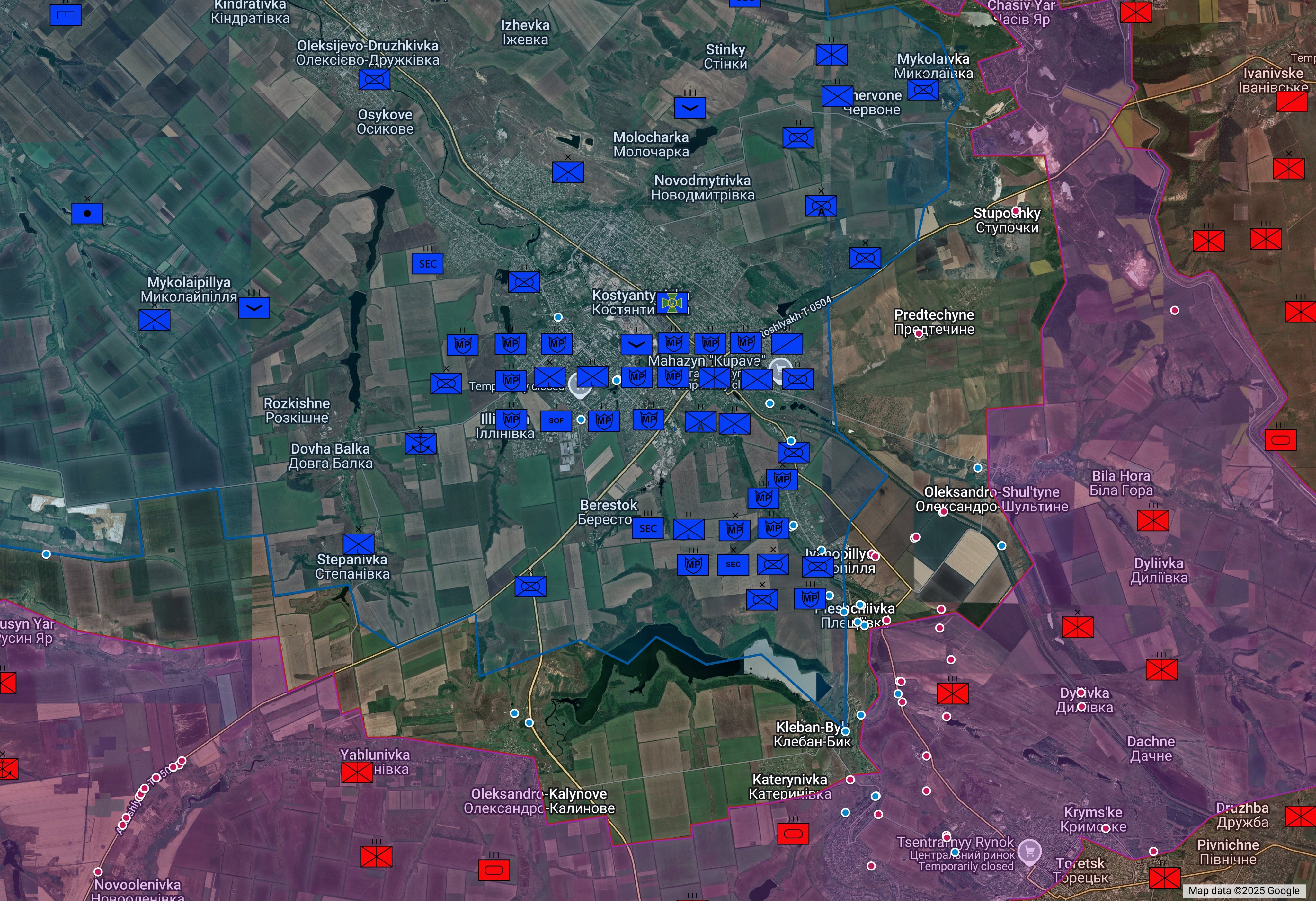 En dirección a Konstyantynivka, aunque ya la semana pasada había cuentas que hablaban de una retirada ucraniana de todo el territorio al sur de Kleban-Byk (una vez más), todo indica que los ucranianos continúan operando en la zona, al menos si no con unidades completas, sí con incursiones destinadas a mantener a los rusos alejados el máximo tiempo posible de los embalses.