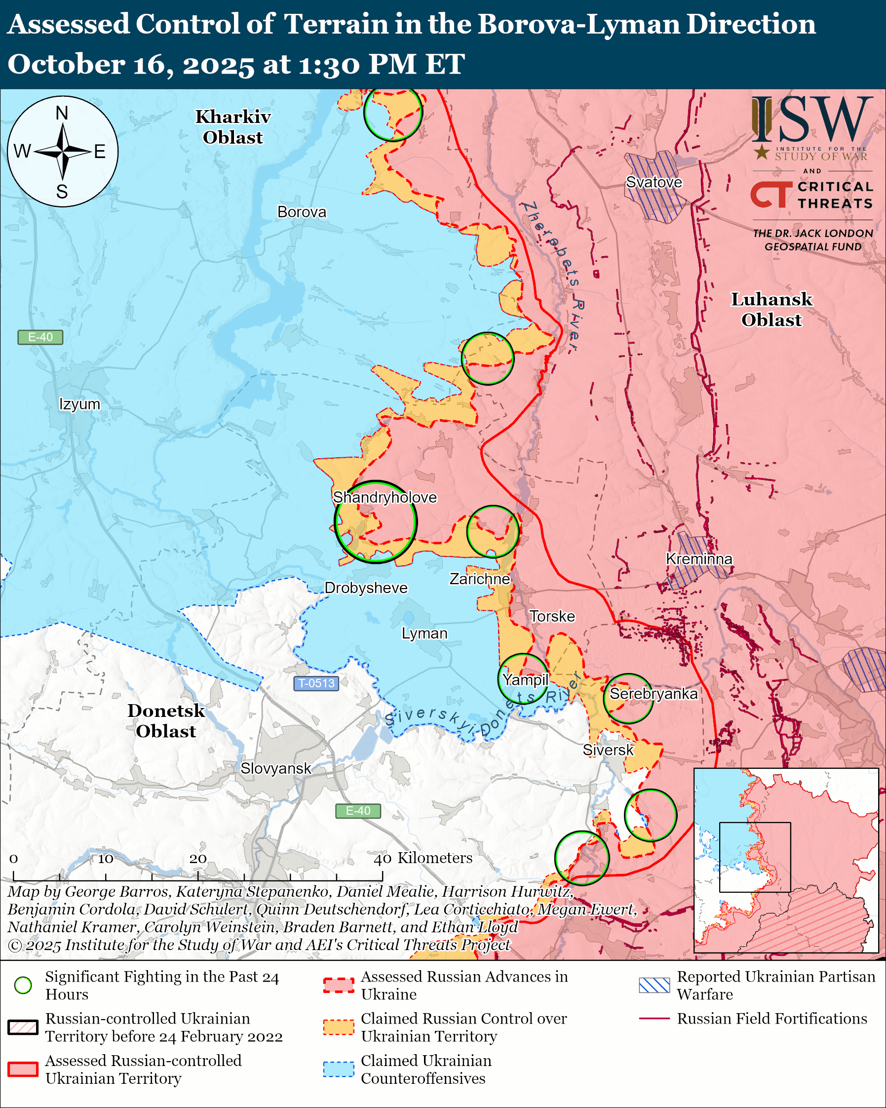 En dirección a Limán, se han producido nuevos combates tanto en el saliente de Sandryholove, al norte, como en el área en torno a Yampil, aunque sin cambios aparentes respecto a la jornada anterior.