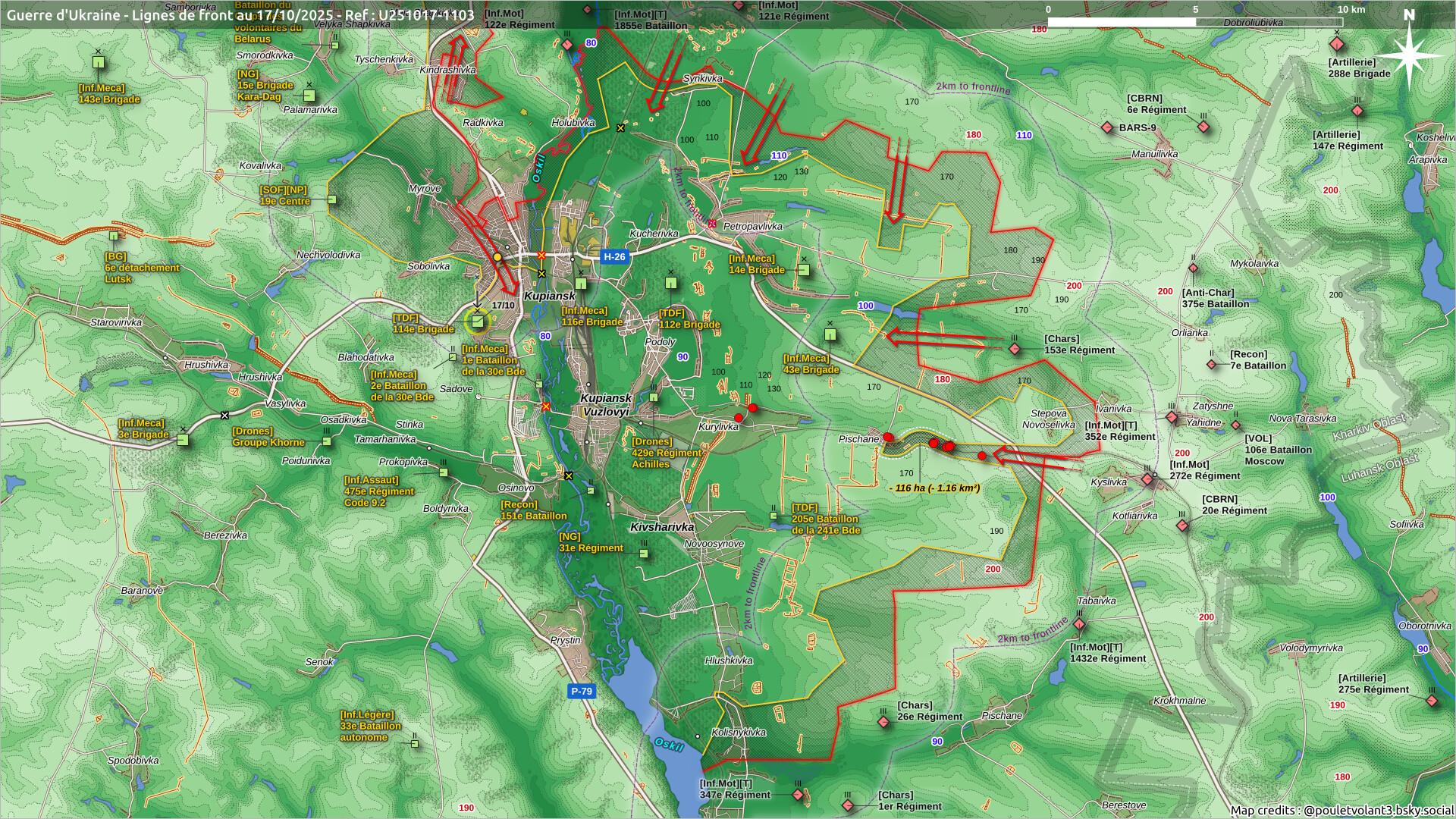 Seguimos por el sector del Oskil, concretamente a la altura de Kupiansk, pues ha caído en poder ruso Pischane. Una aldea de escaso tamaño, pero que durante mucho tiempo ha sido un pilar de la defensa ucraniana al este del Oskil. Los avances han estado precedidos de importantes bombardeos con FABs.