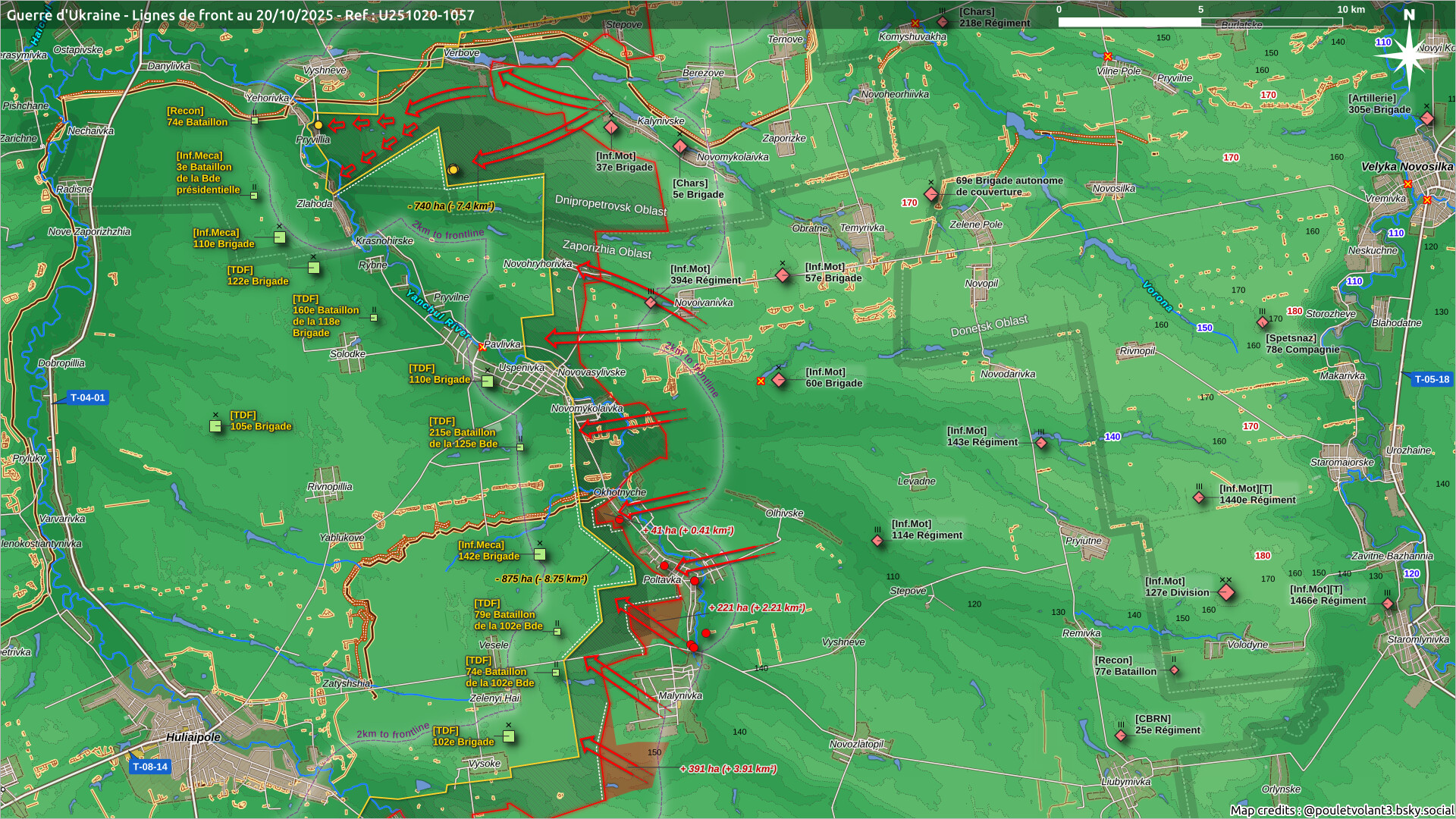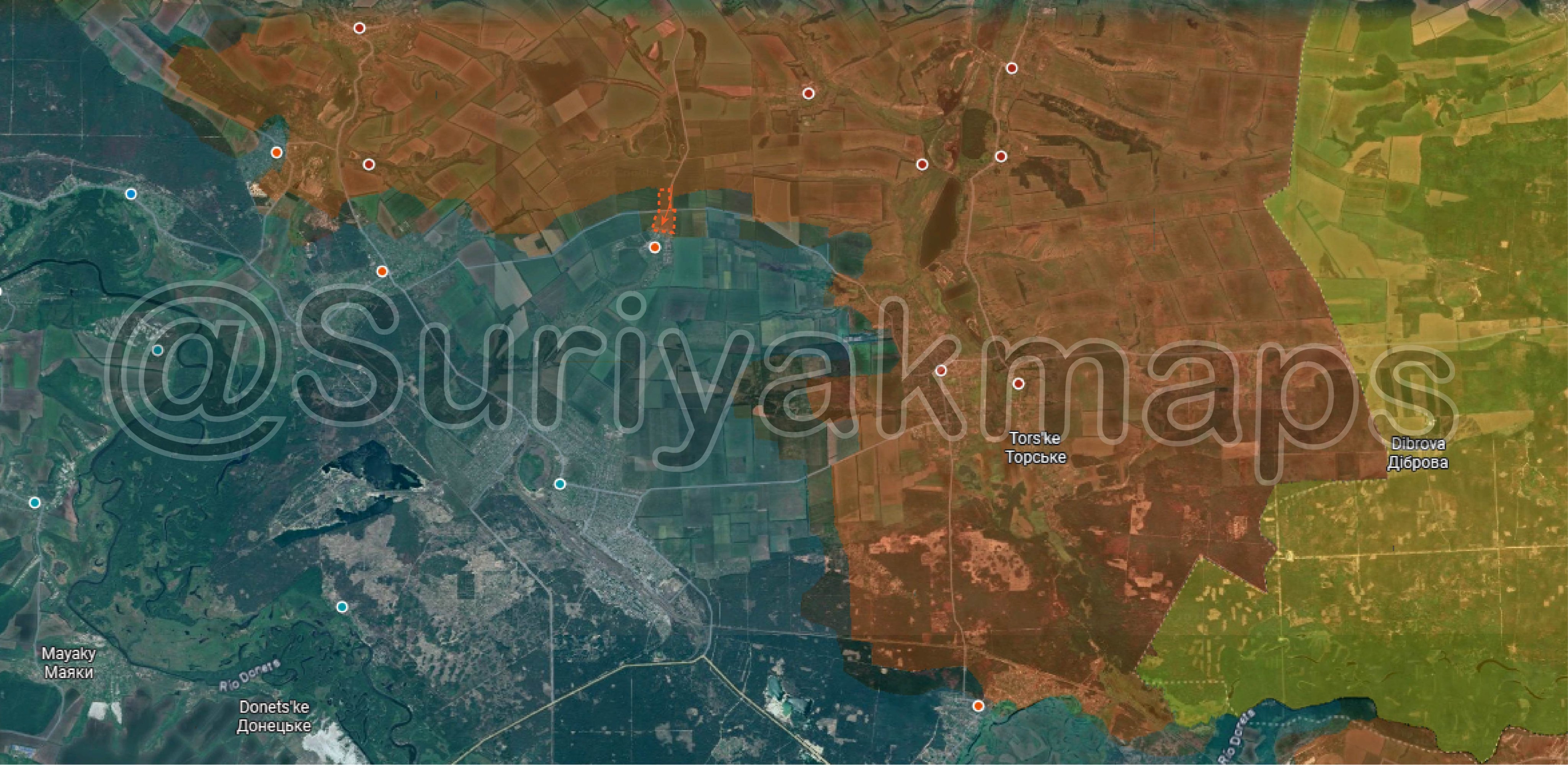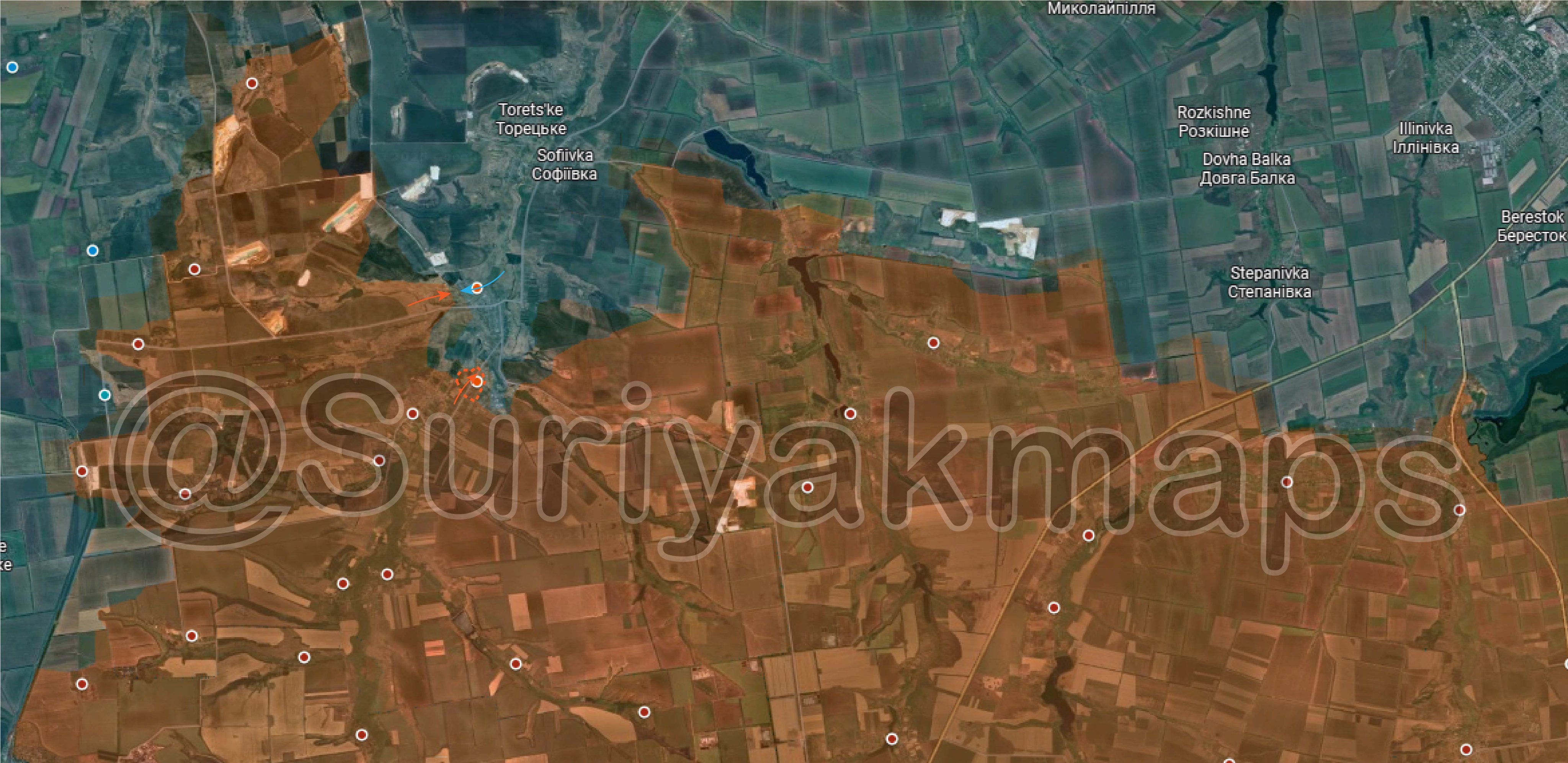 En dirección al Dniéper, en las últimas jornadas el mayor empeño ruso se localiza al sur, tanto hacia Orijiv, como hacia Novomykholaivka, buscando romper las defensas ucranianas del resto de la región de Zaporiyia, ya que de quedar en una situación precaria, los ucranianos se verían obligados a trasladar tropas desde puntos del frente más importantes para Rusia, como los que defienden Sloviansk y Kramatorsk. Así, por una parte han seguido presionando en dirección al reío Yanchur. Por otra, se han podido ver asaltos empleando tanto motocicletas como «carros tortuga» (últimamente se están desarrollando interesantes blindajes puercoespín), todo ello apoyado por drones FPV, hacia Mala Tokmachka, logrando algunos avances hacia el centro de la localidad. También fortísimos bombardeos al norte y noreste de Stepnohirsk.