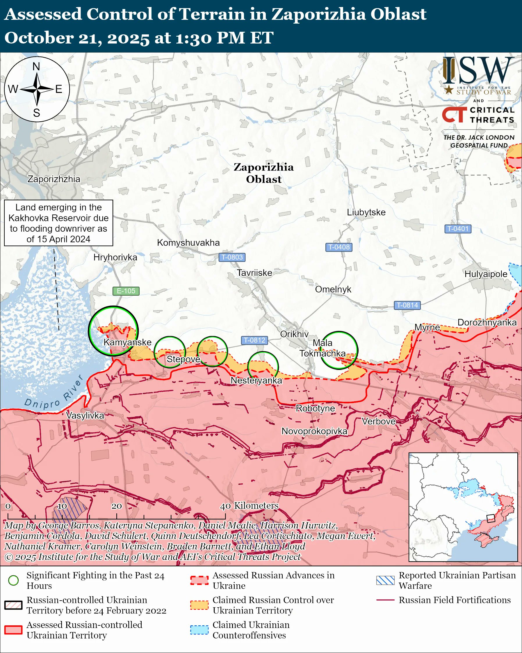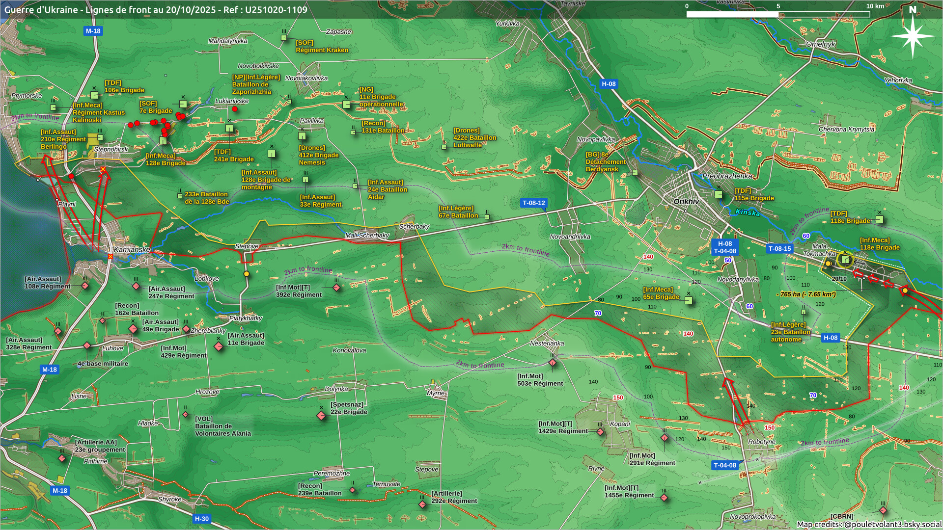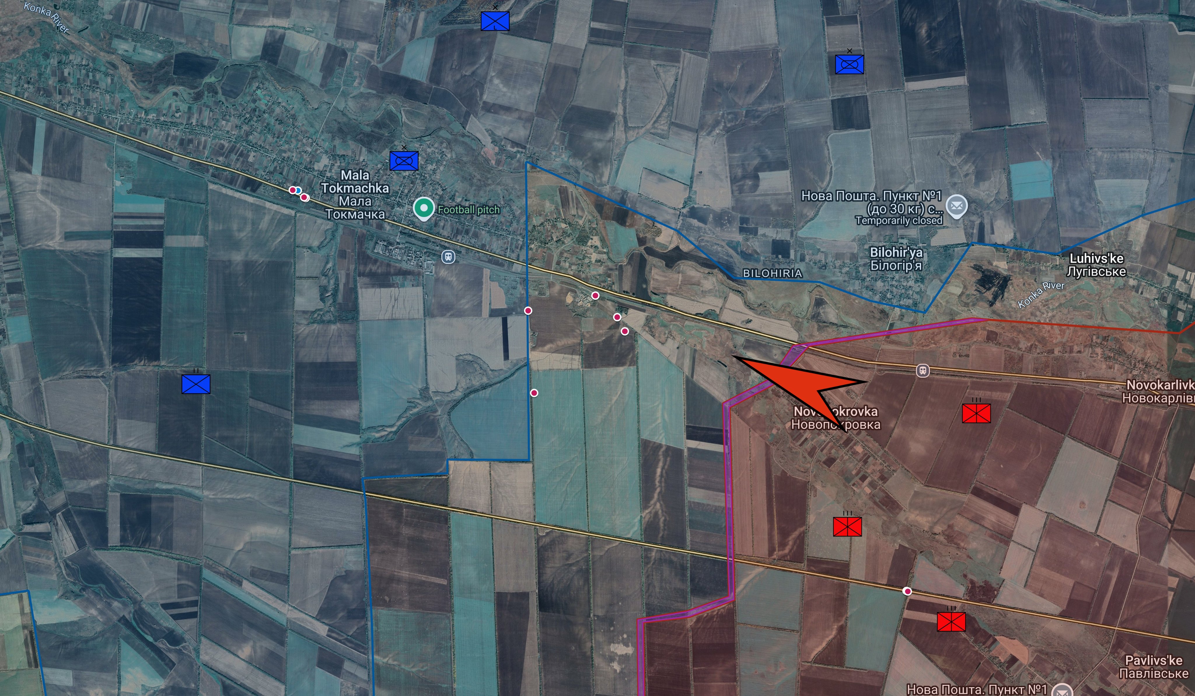 En dirección al Dniéper, en las últimas jornadas el mayor empeño ruso se localiza al sur, tanto hacia Orijiv, como hacia Novomykholaivka, buscando romper las defensas ucranianas del resto de la región de Zaporiyia, ya que de quedar en una situación precaria, los ucranianos se verían obligados a trasladar tropas desde puntos del frente más importantes para Rusia, como los que defienden Sloviansk y Kramatorsk. Así, por una parte han seguido presionando en dirección al reío Yanchur. Por otra, se han podido ver asaltos empleando tanto motocicletas como «carros tortuga» (últimamente se están desarrollando interesantes blindajes puercoespín), todo ello apoyado por drones FPV, hacia Mala Tokmachka, logrando algunos avances hacia el centro de la localidad. También fortísimos bombardeos al norte y noreste de Stepnohirsk.
