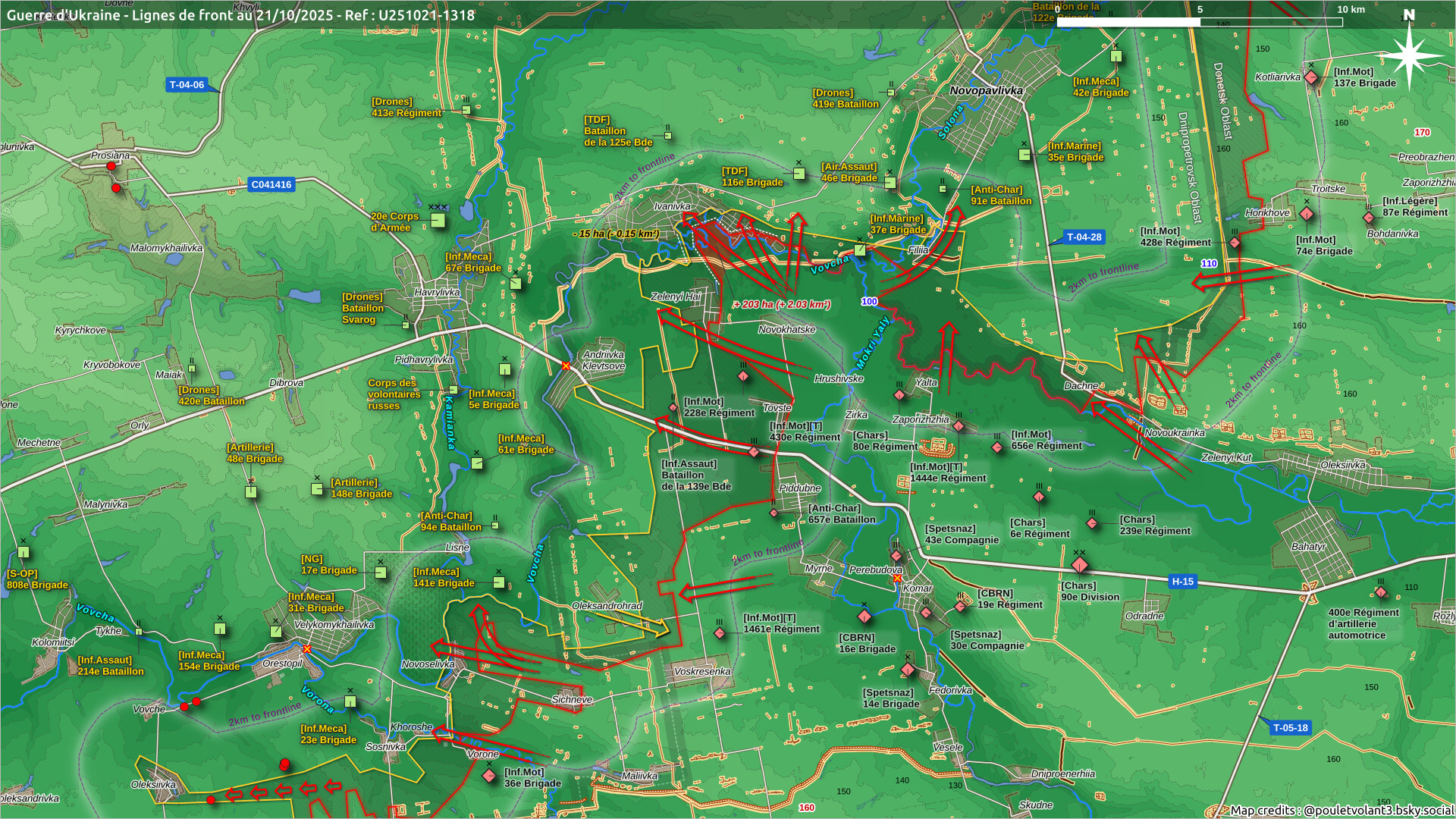 En el vecino sector de Pokrovsk, prosiguen los ataques ucranianos a todo lo ancho del mismo, así como los intentos de infiltración destinados a desgajar el sur del sector, para lo que avanzan también desde el este, a la altura de Balahan, habiendo tomado en las últimas horas Kozatske, ligeramente más al sur. Dicho esto, hay fuentes que hablan de una retirada ucraniana de Myrhorad y Pokrovsk, si bien las informaciones son contradictorias y podría tratarse de una rotación (momento crítico) antes de introducir nuevas unidades mejor pertrechadas, formadas y alistadas. Además, también hay noticias de avances rusos al oeste de Udachne, hacia Molodetske.