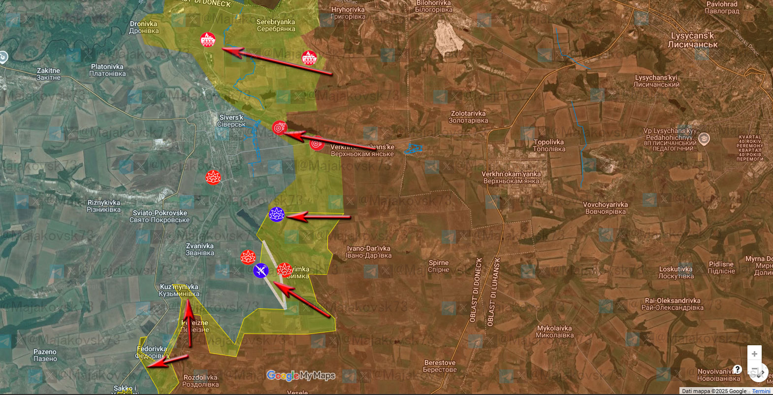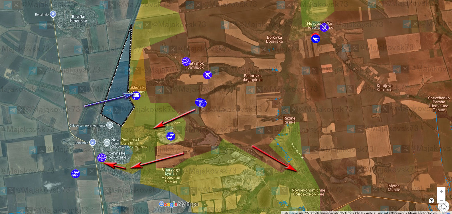 En dirección a Dobropillia, aprovechando el mal tiempo, que impide volar a parte de la flota de drones, limitando tanto las posibilidades de ataque como la conciencia situacional, los rusos han lanzado nuevos asaltos hacia Shakove, al tiempo que progresan en Ivanivka y en Filiya.