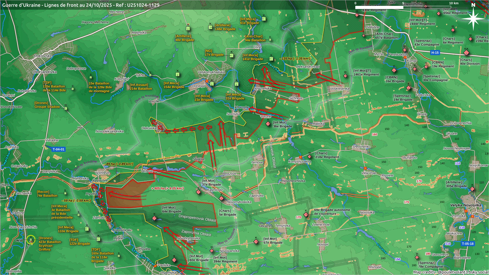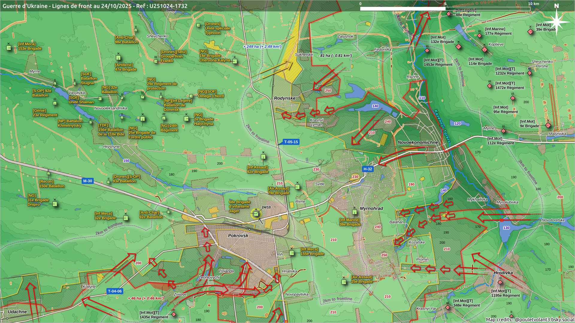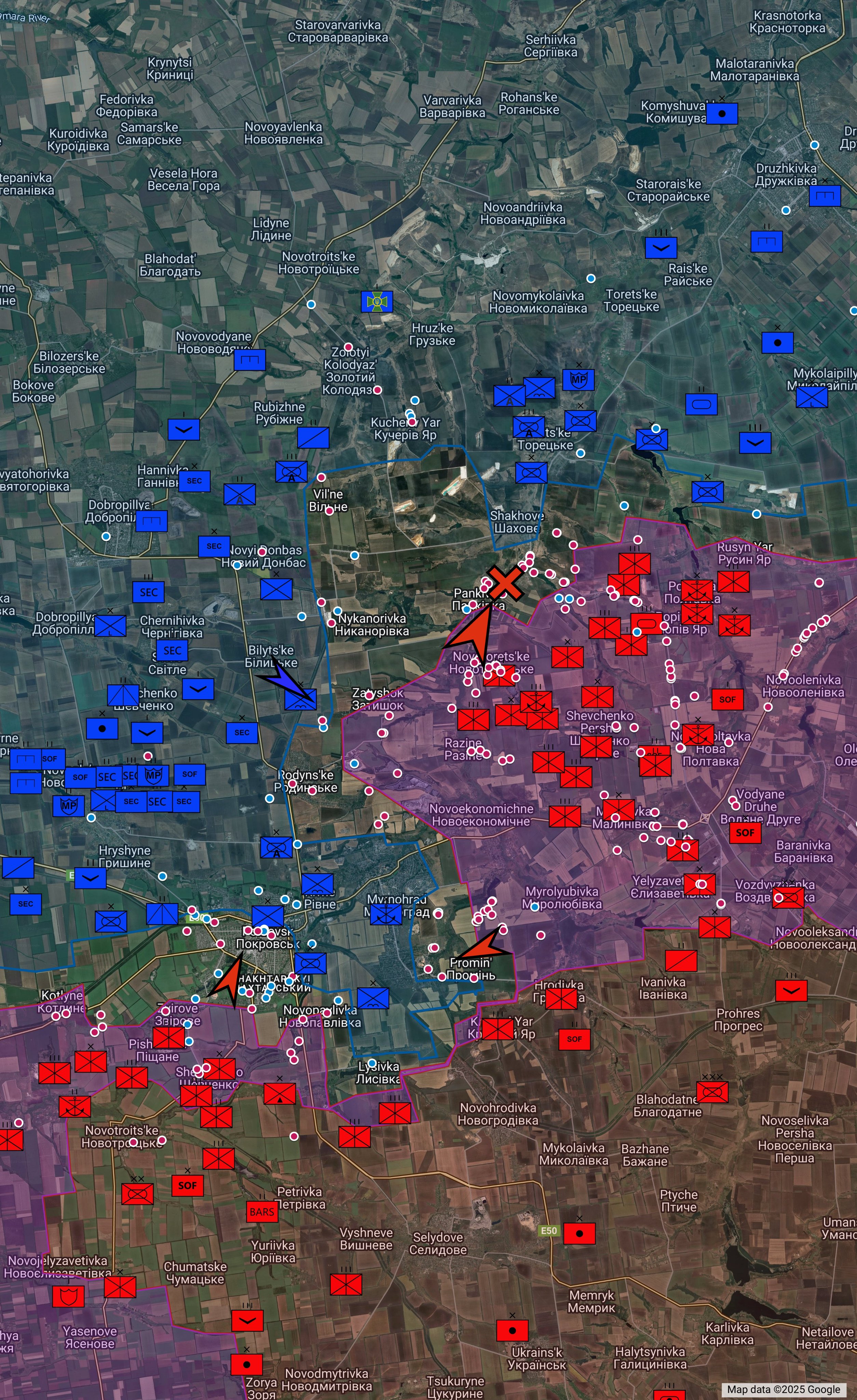En dirección a Pokrovsk, se ha producido un nuevo asalto mecanizado (con la misma intención no de utilizar los blindados por su poder de fuego, sino como transporte para cruzar la zona de muerte con la mayor cantidad posible de efectivos) y se habla de la presencia de hasta 250 efectivos rusos en el interior de la ciudad, mientras se libran combates intensos. La situación más crítica sigue siendo la que se vive en Rodinske, donde continúan los intentos rusos por tomar esta localidad al norte de las ciudades gemelas.