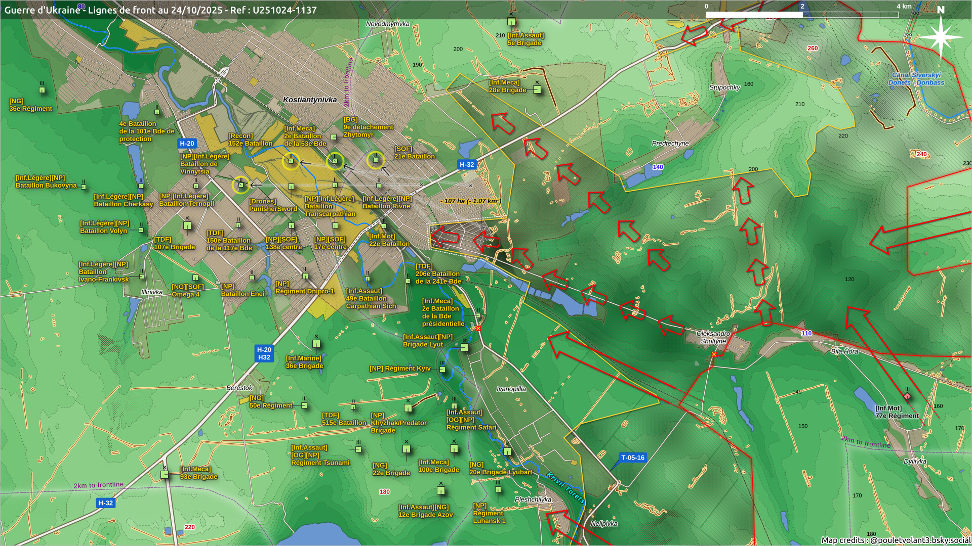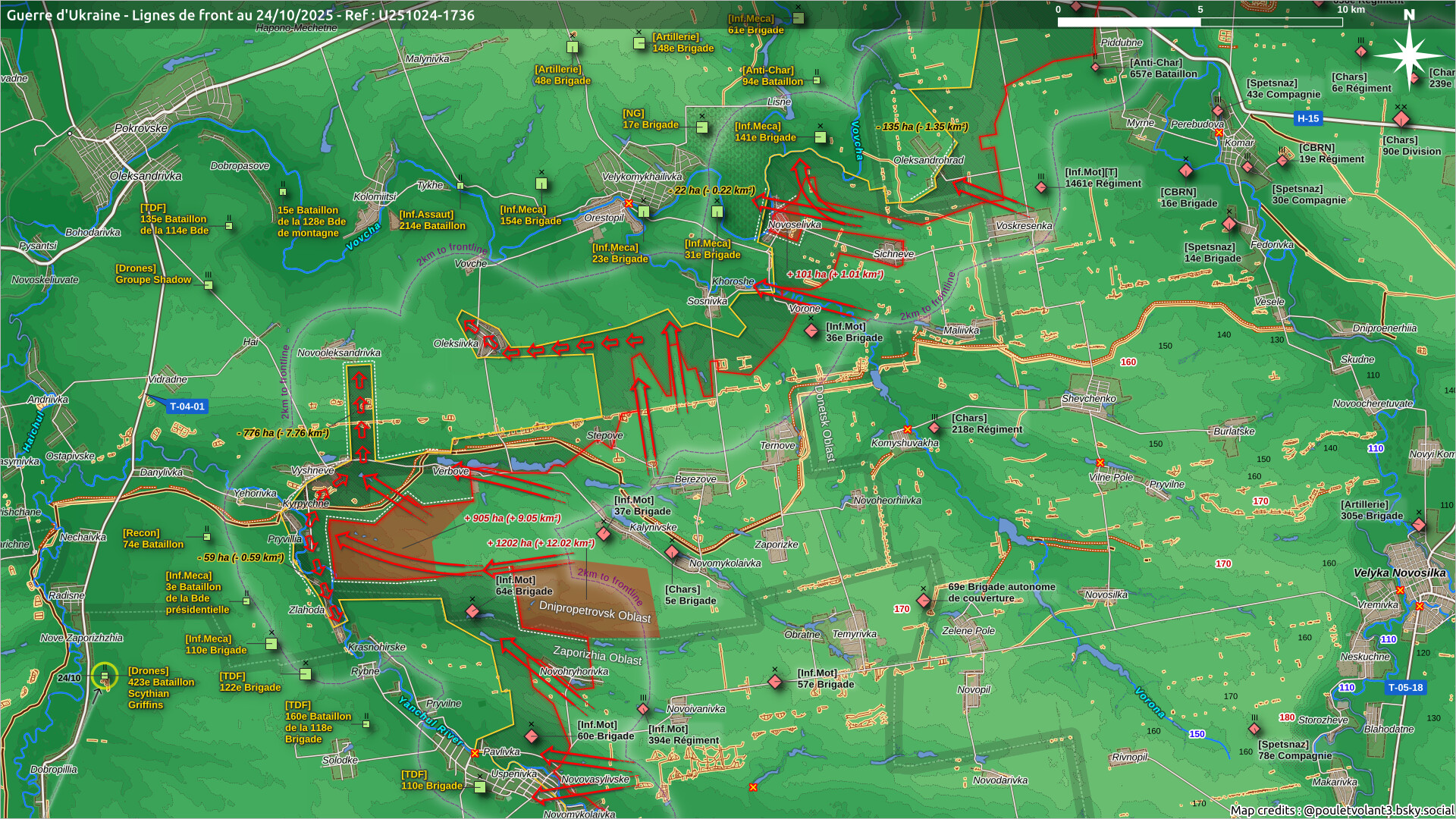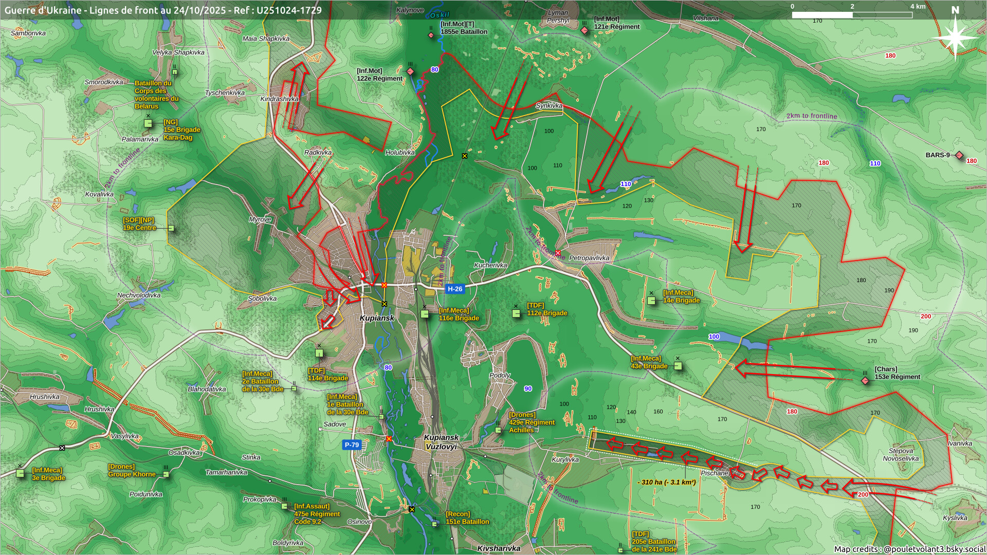 En dirección a Pokrovsk, se ha producido un nuevo asalto mecanizado (con la misma intención no de utilizar los blindados por su poder de fuego, sino como transporte para cruzar la zona de muerte con la mayor cantidad posible de efectivos) y se habla de la presencia de hasta 250 efectivos rusos en el interior de la ciudad, mientras se libran combates intensos. La situación más crítica sigue siendo la que se vive en Rodinske, donde continúan los intentos rusos por tomar esta localidad al norte de las ciudades gemelas.