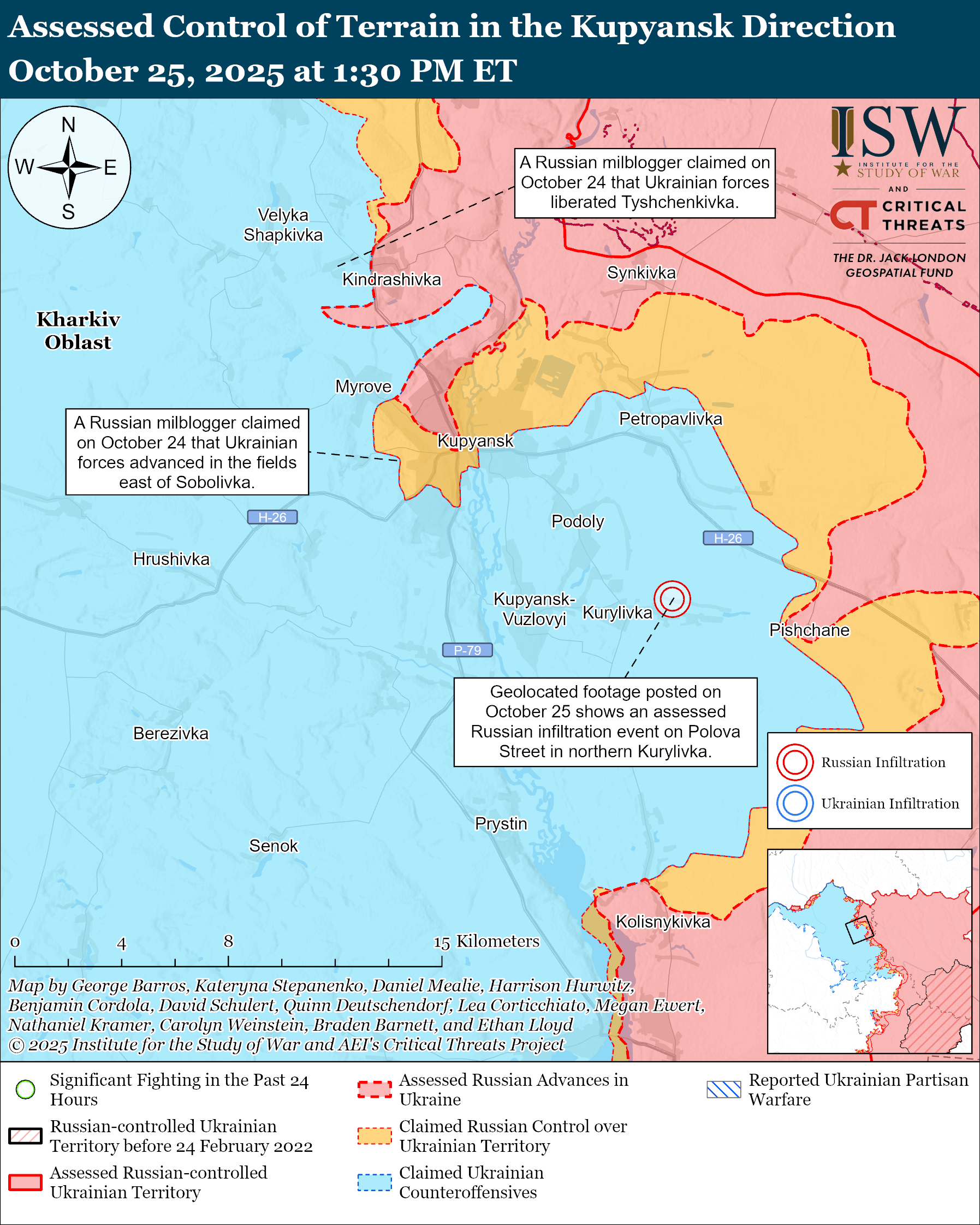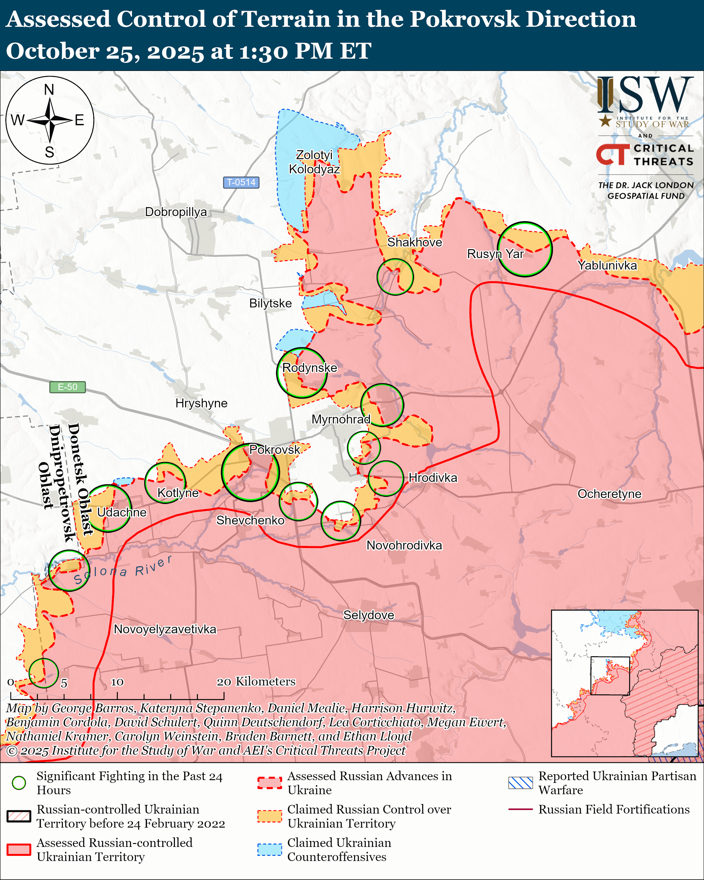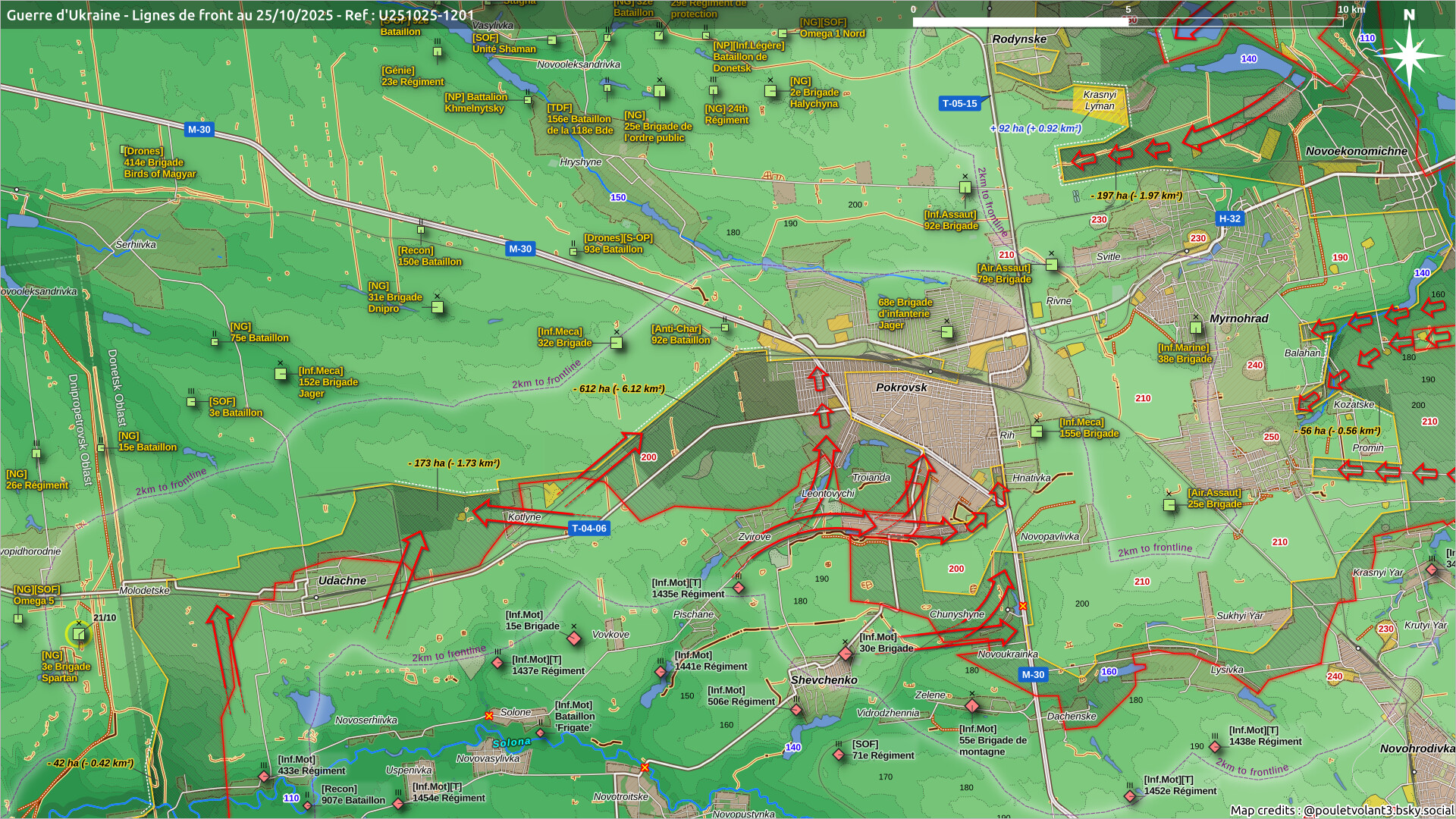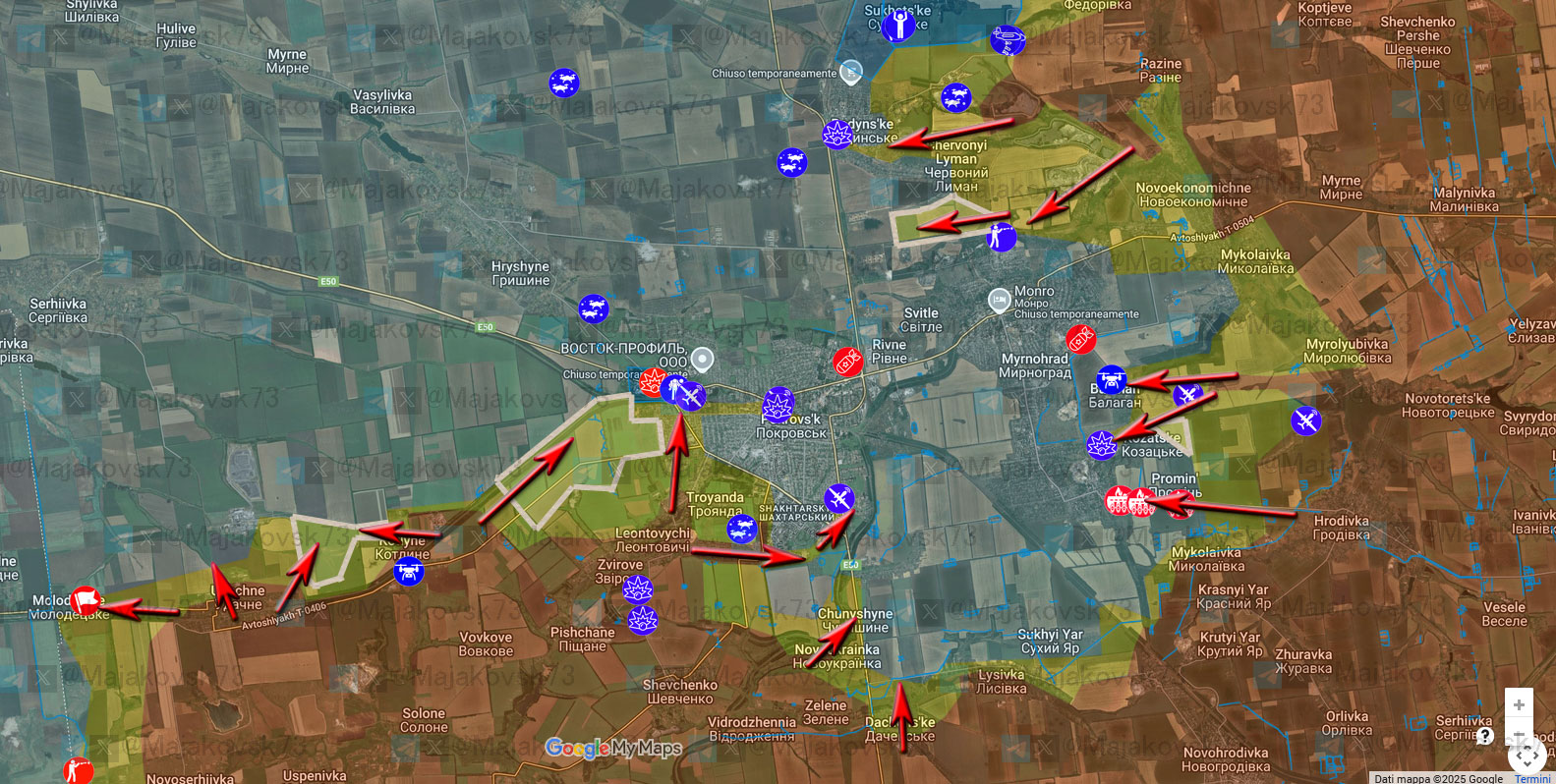 Precisamente, en estar últimas (Myrhorad y Pokrovsk), se admite ya que hay al menos 200 militares rusos infiltrados, lo que quiere decir que han sido capaces de superar las porosas defensas ucranianas, espaciadas y basadas en un número limitado de tropas (única forma de sobrevivir a la lluvia de FABs), actuando a retaguardia de estas e intentando hacerse fuerte mientras son batidos por drones de las AFU. Avances que han sido posibles, entre otras cosas, por la ventana de oportunidad meteorológica de los últimos tiempos, lo que ha permitido a los rusos llegar incluso a Synelnikove.