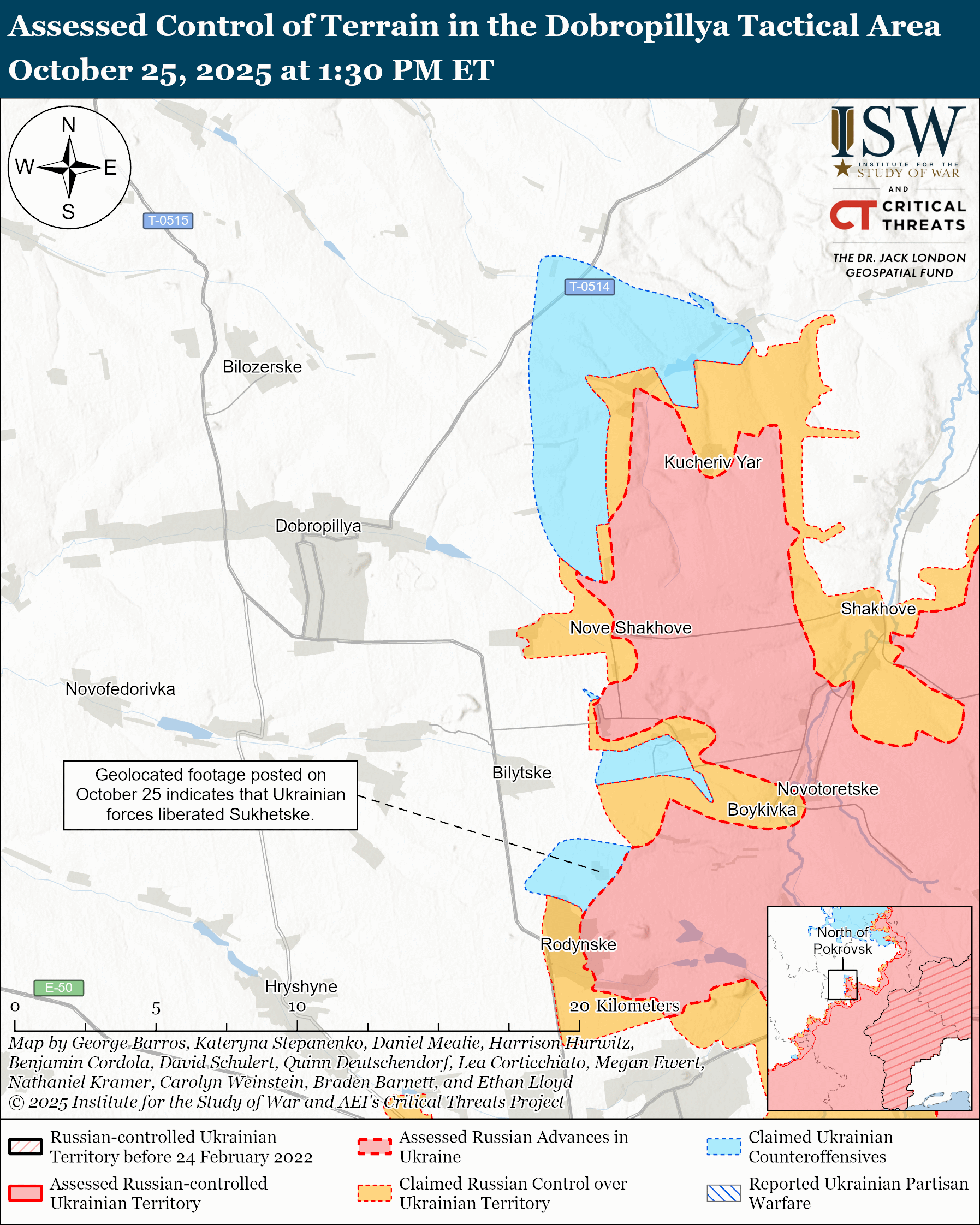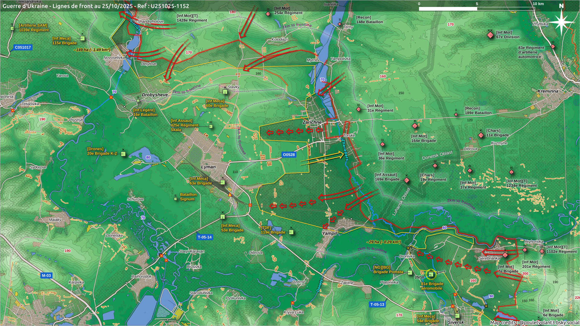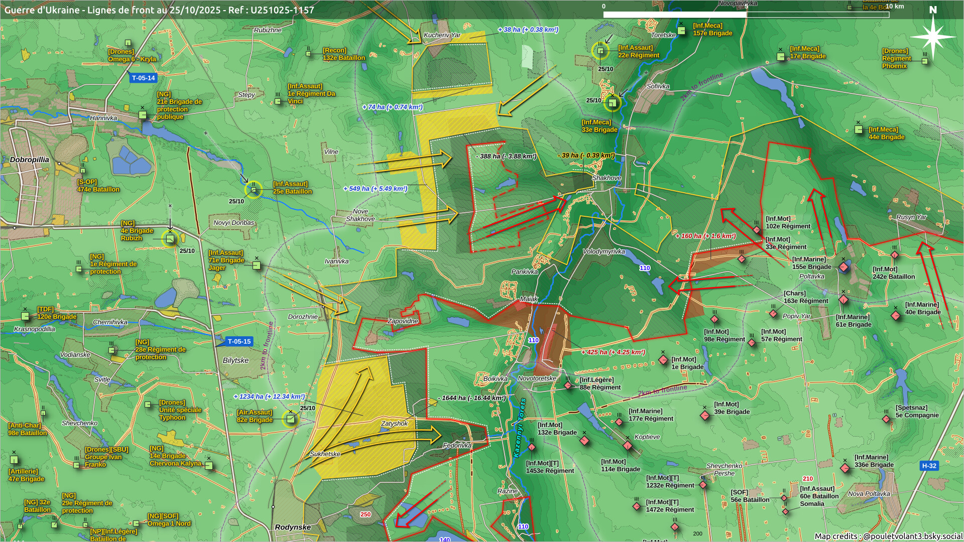 En dirección a Dobropillia, continúan trascendiendo datos sobre el resultado de los últimos asaltos blindados rusos hacia Shakove. Los ucranianos, por su parte, habrían lanzado un contraataque en toda la zona al norte de Rondinske, retomando Shuketske e intentando minar la base de un saliente que supone una amenaza tanto para Dobropillia, como para Rodinske, que sigue siendo asaltada. Buscan así los ucranianos no verse rodeados desde el norte, a la espera de que puedan intentar hacer lo propio al sur de las ciudades gemelas.