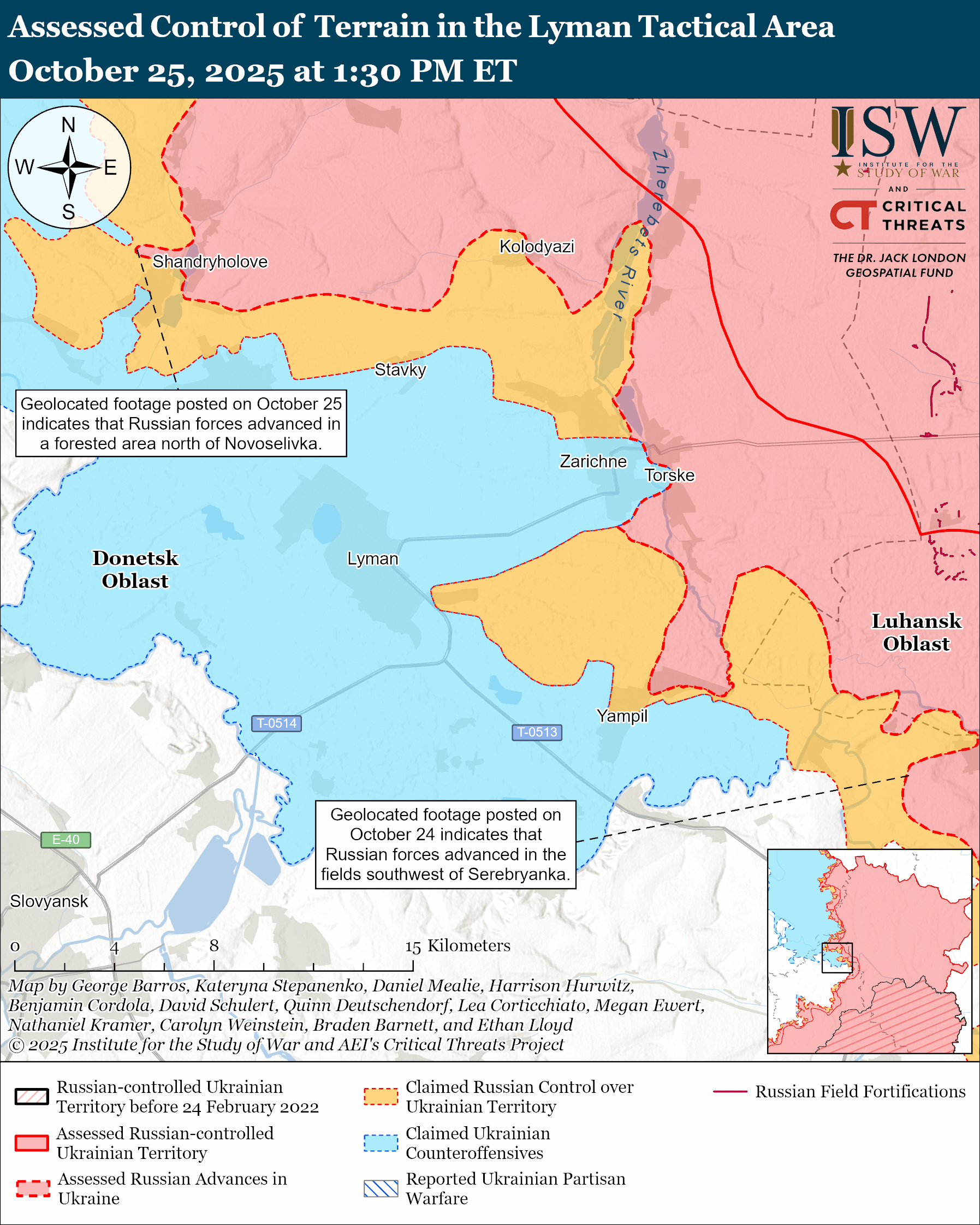 Entre el sector anterior y el de Siversk, en dirección a Limán, prosiguen los intentos rusos de alcanzar dicha ciudad, lanzando largas incursiones, al tiempo que mantienen la presión tanto al norte, en el saliente de Sandryholove, como al sureste, en los bosques de Serebryanske y sus alrededores.