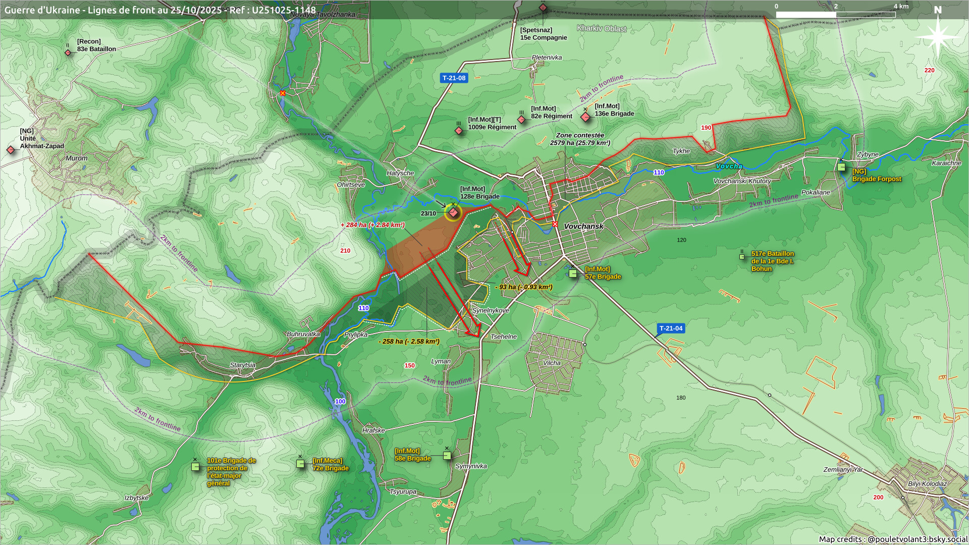 En cuanto al sur del frente, por último, tenemos en el sector del Vovcha por un lado nuevos progresos en torno a Filiya, avanzando parapetados por los cortavientos los rusos, como también, por otro, progresos igualmente rusos al sureste de Yehorivka.