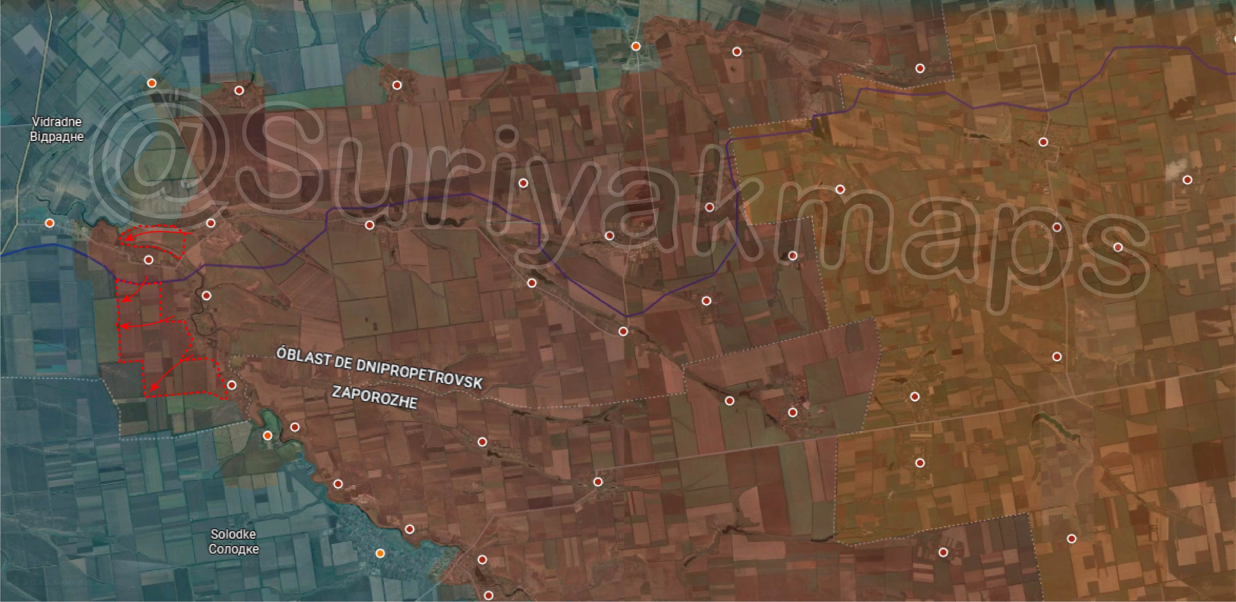 En dirección al Dniéper, sigue la presión rusa más allá del río Yanchur, con la vista puesta como explicamos en informes previos en tomar el espacio entre la línea actual del frente y la carretera Pokrovske-Gualiaipolé.