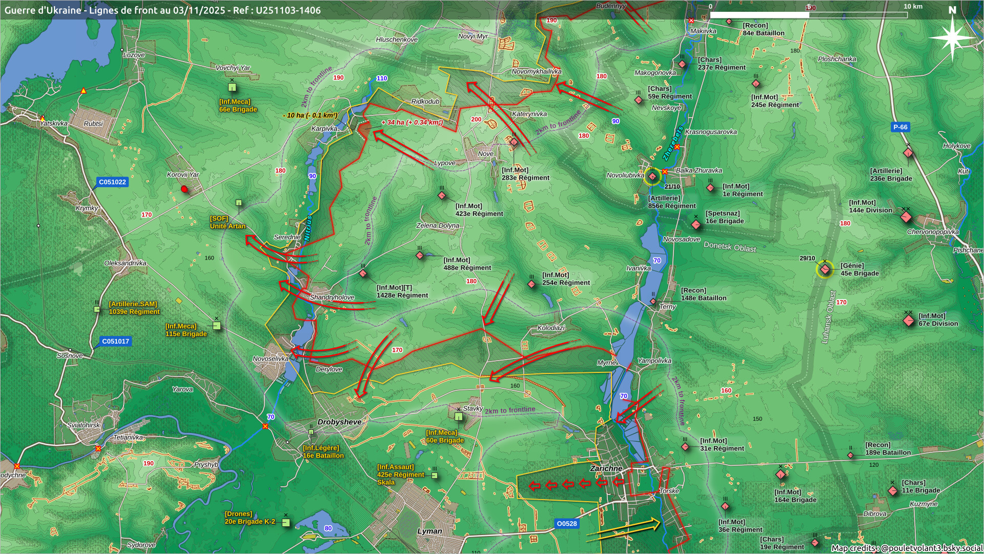 En dirección a Limán, se habría producido un intento de alcanzar las defensas en torno a esta ciudad desde Zarichne. Además, se ha reportado un ataque ruso en la zona de Karpova.