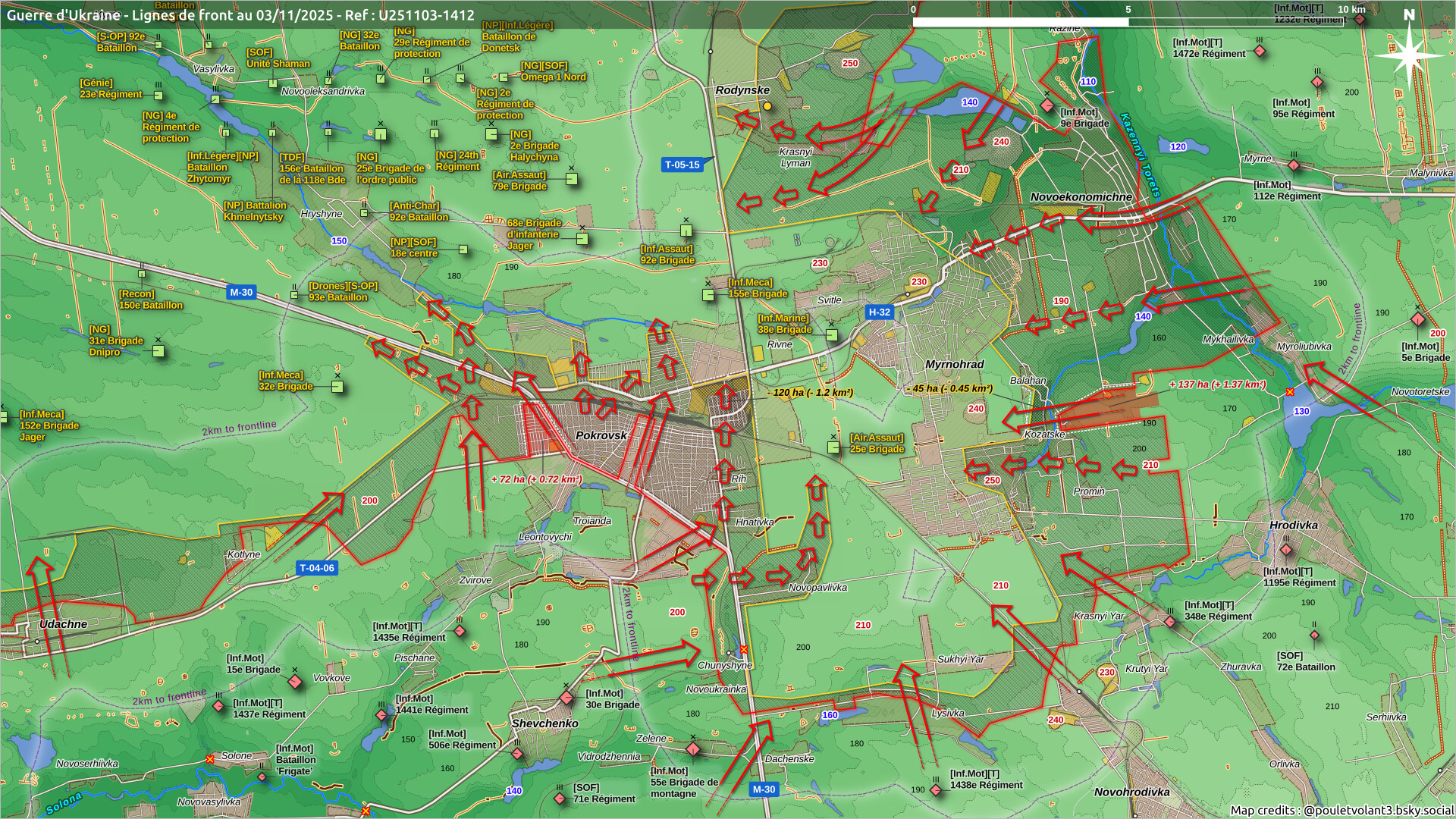 La noticia más esperada del día era la publicación del Informe del Paquete de Ampliación de la Unión Europea, en el que se recoge el progreso de Ucrania en su camino hacia la adhesión, país que estaría listo para abrir tres nuevos clústeres de negociación. Por otra parte, continuamos sin avances tangibles en lo que concierne a las negociaciones de paz o al empleo de los activos rusos congelados. Además, desde Rusia se ha procedido al enviar sistemas antiaéreos a Venezuela, intentando ofrecer un respaldo, aunque sea simbólico, al régimen de Maduro. Más allá de esto, mientras los intercambios a larga distancia o las acciones en la zona gris continúan, incluyendo el cierre temporal del aeropuerto de Bruselas por el avistamiento de drones sin identificar, lo más relevante de las últimas horas ha tenido lugar en Myrhorad/Pokrovsk, en donde la situación se degrada rápidamente, con el temor a que sea imposible la evacuación de todos los militares de las AFU que siguen aun en Myrhorad.