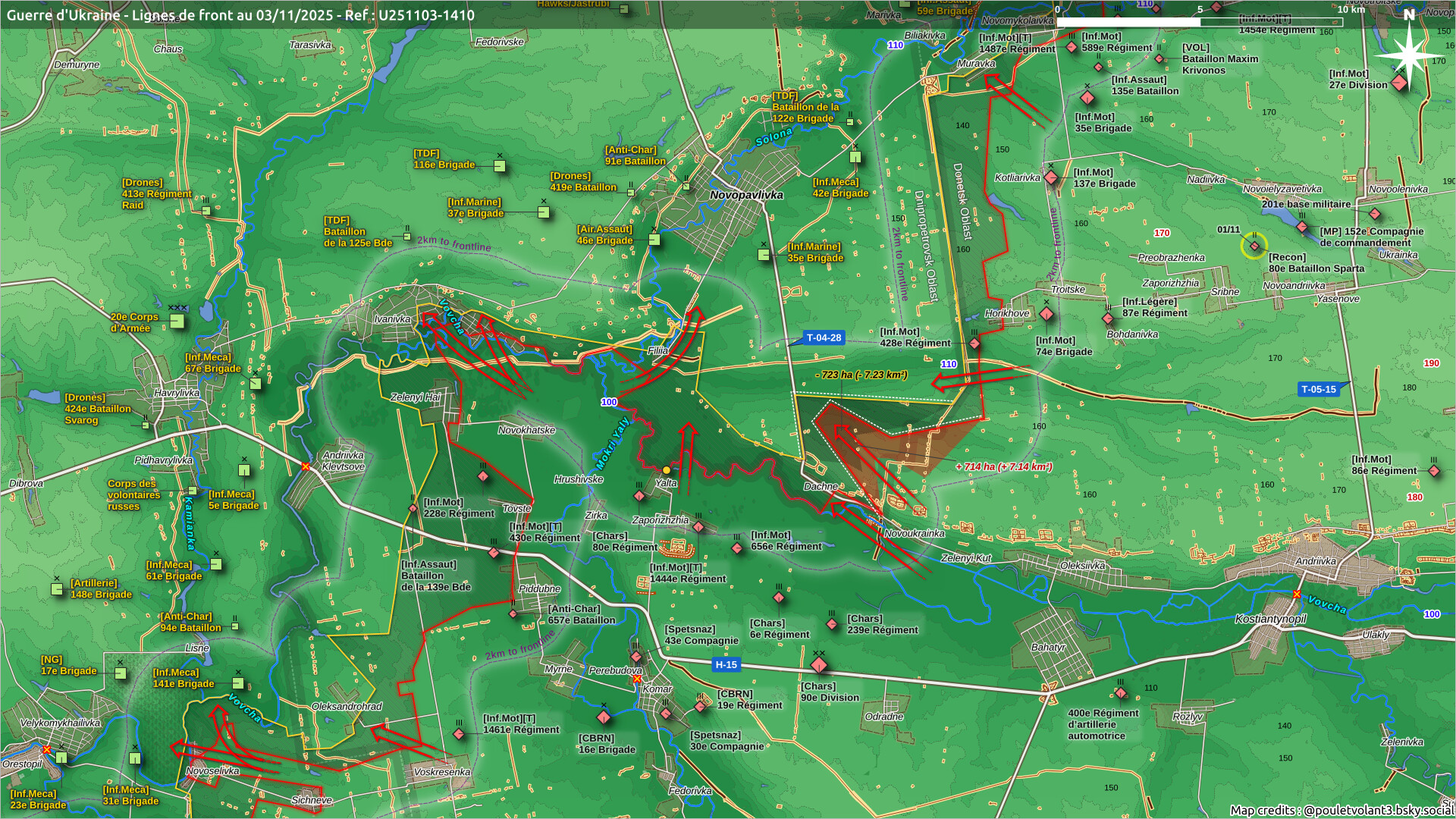 En cuanto a Myrhorad/Pokrovsk, la situación continúa agravándose y, a pesar de que desde Ucrania insisten en que no hay ningún cerco en la zona, la salida de los militares que siguen en Myrhorad es como poco extremadamente complicada, ya que la retirada debe hacerse por el norte (de ahí el papel de Rondins’ke, que los ucranianos intentan retomar), dado el control ruso bien físico, bien por el fuego, de la ruta de salida hacia el oeste. Además, según afirman desde la propia Ucrania, las líneas de frente, tras la infiltración de los DRGs rusos, a los que asignan el control del 60% de Pokrovsk, habría desaparecido. De hecho, los militares rusos han sido avistados en zonas muy norteñas de esta ciudad, lo que junto a los drones sería el mayor obstáculo a cualquier evacuación por la ruta oriental (hay quien habla de catástrofe) y lo que también tendría que ver con los intentos, un tanto desesperados, de utilizar unidades especiales del GUR para asegurar la salida probablemente de mandos ucranianos atrapados en la zona industrial. En cualquier caso, la caída de ambas ciudades parece cuestión de días, más que de semanas, con lo que previsiblemente el frente se aplanará en la zona, máxime si Rusia consigue también a posteriori la toma de Konstyanytinivka, a donde reconducirá unidades con toda seguridad.